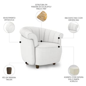 Com pés em madeira 6cm, revestimento em boucle, o visual é elegante e atemporal, com textura agradável e toque suave que harmoniza facilmente com qualquer estilo de decoração.