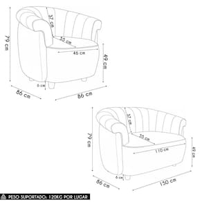 Dimensão dos Produtos (LxAxP) Sofá Namoradeira: 150 x 79 x 86 cm. Poltrona: 86 x 79 x 86 cm. Peso: 66 Kg.