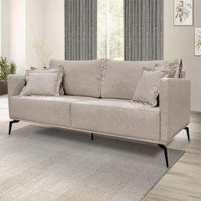 A Sofá Living tem os pés de aço e acabamento elegante na cor preta, ele oferece não apenas estabilidade, mas também um toque de sofisticação ao ambiente assim como o seu revestimento em linho. O assento, feito com espuma HR28 e plumante de silicone, promete ser o refúgio perfeito após um longo dia, enquanto as quatro almofadas decorativas complementam o visual com um charme adicional. A durabilidade é assegurada pela estrutura de madeira maciça de eucalipto, e o encosto em almofada solta com fibra de silicone se adapta perfeitamente ao corpo, proporcionando uma experiência de relaxamento inigualável. Este Sofá 2 Lugares não é apenas um móvel, mas um investimento em bem-estar e estilo para a sua Sala de Estar.
