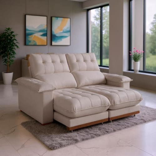 O Sofá 2 Lugares 2,00m Retrátil e Reclinável Milano Bom Pastor é sinônimo de conforto e elegância. Produzido direto da fábrica, conta com molas ensacadas e espuma D33 que garantem maciez e durabilidade, além do exclusivo Mega Pillow Top de 30cm que proporciona aconchego extra. Seu sistema de catraca blindada permite ajustes precisos no encosto, enquanto o design bipartido facilita o transporte e a instalação. Com detalhe em madeira MDF, une sofisticação e resistência. Quando aberto, atinge 1,80m de profundidade, ideal para momentos de descanso completo.