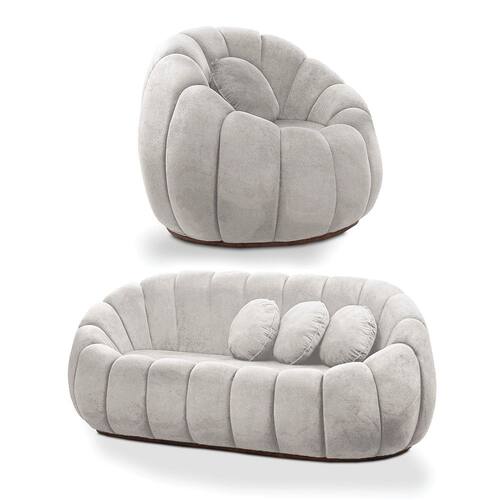 O Sofá Namoradeira e Poltrona Giratória Cloud é um kit que combina formas artísticas, conforto e durabilidade. Ele tem um design orgânico que remete às formas encontradas na natureza como as nuvens criando um espaço acolhedor e relaxante. Além da sua simetria e curvas suaves, a poltrona possui base arco giratório e a namoradeira contém sapatas plásticas (Fixa), ambos com revestimento em tecido Bouclê que cria uma conexão entre a peça e o ambiente. Pode ser utilizado em sala de estar, recepções, escritórios, lojas e espaços comerciais, ou qualquer outro espaço que você queira decorar com estilo e bom gosto. Ele tem uma estrutura em madeira de reflorestamento eucalipto, que garante a resistência e a sustentabilidade do produto. Ele suporta até 180 kg de peso, podendo ser utilizada por pessoas de diferentes biotipos. Inclui almofada solta com enchimento de fibra siliconada, oferecendo versatilidade para diferentes usos e necessidades. Ele tem um acabamento reforçado e espuma de qualidade D24, que oferece maciez e aconchego. Ele apresenta detalhes de costura refinados em formato arredondado resultando em um acabamento impecável conferindo muito mais valor e elegância ao produto. Ele é fácil de transportar, pois tem um peso leve e um tamanho compacto. O Sofá Namoradeira e Poltrona Giratória Cloud é um conjunto que vai fazer a diferença na sua decoração e no seu bem-estar. Garanta já o seu!
