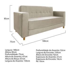 Muito além de decorar um ambiente, na atualidade, poltronas ocupam um lugar de destaque nos mais diversos lares, pois, geralmente transmitem o que há de mais singular na personalidade de quem as escolhe. Com o Sofá Denver, essa singularidade é expressa através de sofisticação, qualidade e bom gosto! Projetado para atender sua expectativa, apresentando estilo clássico, sem deixar de ser moderno, o Sofá Denver foi feito para você que preza conforto e bem estar, além de requinte e distinção. Não perca essa oportunidade e adquira já o seu! Especificações Técnicas do Sofá Denver: - Altura: 85 cm; - Largura: 180 cm; - Profundidade: 75 cm; - Altura do Assento: 47 cm; - Altura do Braço: 67 cm; - Largura do Assento: 150 cm; - Profundidade do Assento: 52 cm; - Largura do Encosto: 150 cm; - Altura do Encosto: 42 cm; - Espessura do Assento: 21 cm; - Espessura do Encosto: 16 cm; - Altura do Pé: 10 cm. - Peso: 35 kg. - Peso Suportado: 240 kg. Diferenciais do Sofá Denver: - Material da Estrutura: fabricado com Madeira Pinus e Eucalipto Reflorestada, e alguns detalhes em MDF; - Tipo de Assento: estofado e com espuma de densidade D-26; - Tipo de Encosto: estofado e com espuma de densidade D-18; - Detalhes dos Pés: acompanha kit de pés (4 pés) de madeira, no estilo quadrado na cor mel, com alta resistência; - Volumes: nessa compra você receberá um único produto. Recomendações de limpeza: -Limpar com flanela limpa e seca. Não molhar o móvel e não expor em lugar úmido ou próximo de fontes de calor. Não usar produtos abrasivos. Observações Importantes: - As imagens ambientadas são meramente ilustrativas e podem apresentar itens que não compõe o produto; - Objetos decorativos que aparecem na foto não acompanham o produto; - As cores do produto podem variar de acordo com o monitor, a iluminação do ambiente, ou sua percepção visual; - o Sofá Denver chegará desmontado para você, bastando rosquear os pés; - Confira as dimensões antes da compra e certifique-se de que o produto passará por elevadores, portas e corredores, já que nossa não inclui a subida de lances de escada, ou o de produtos; - Ao receber seus produtos, verifique no ato do qualquer dano na embalagem. Caso tenha alguma , favor não assinar o de (A transportadora tem obrigação de esperar a conferência); - Produto para uso residencial em ambiente interno, não devendo ficar exposto diretamente ao sol, calor e umidades excessivas.