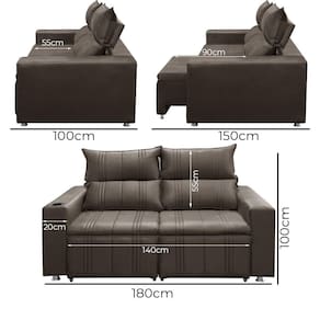 Dimensões do Produto: Largura: 180 cm Altura: 100 cm. Profundidade: 100 cm. Altura do chão ao assento: 45 cm Largura do Braço: 20 cm Medidas Internas do Assento: 140 x 55 cm Peso: 55 KG