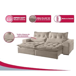 Informacoes Tecnicas: Material da Estrutura: Madeira Eucalipto Reflorestada, Seca e Imunizada Tecido: Veludo Cor do Tecido: Bege Assento: Retratil, Mola Espiral, Espuma D26 Soft, Manta Siliconada Encosto: Reclinavel em 4 posicoes, Fibra Siliconada Bracos: Densidade D26 Soft Pes: Madeira Tabaco Embalagem: Papel Ondulado, Plastico e Malha : Almofada Rineira, Fibra Siliconizada Capacidade em KG por Lugar: Aproximadamente 180kg