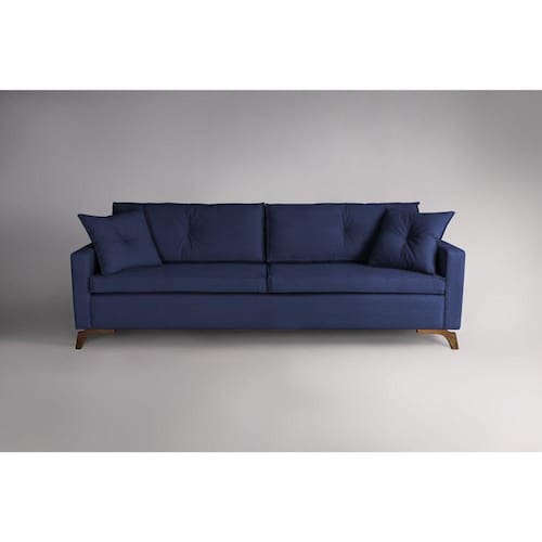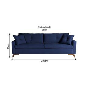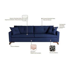 modelo de living, assentos de molas bonnel e percintas elasticas, almofada solta e espuma densidade 28 soft, revestido com manta de silicone, encosto de almofada solta com fibra de silicone, estrutura de madeira de eucalipto, fixação grampos resinados e parafusos. pes em madeira Produto Montado: Sim Acompanha Almofadas extras: 02 Almofada do assento: Removível Almofada do encosto: Removível Altura do assento até o chão: 45.0000 Altura do Encosto: 50 cm Altura dos Pés: 15 cm Ambiente Principal: Sala de Estar codigo_ean: 7909903027271 Complexidade da Montagem: Baixa: pode ser montado por uma pessoa sozinha Cor: Azul Cor do Produto: Azul Densidade do Assento: D-26 Enchimento do Assento: Espuma Enchimento do Encosto: Fibra Siliconada Estilo de Braço: Braços Quadrados Itens Inclusos: 1 Sofá e Manual de Montagem Manual de Montagem e Instalação: https://product-hub-prd.madeiramadeira.com.br/712341/documents/84457883-43c1-4359-8f69-7b5bb021e0f884644manualdemontagemviena.pdf Material dos Pés: Madeira Necessita Montagem: Sim Origem do Produto: Nacional Peso: 50 kg Pet Friendly: Não Possui Percintas Elásticas: Sim Possui Pés: 05 Possui Rodízio: Não Recomendações de Uso, Manutenção e Limpeza: Pano Seco. Detergente Neutro. Não Deixar Exposto ao Sol. Resistente à Chuva: Não Sistema de Montagem: Parafuso Philips Suporta Até (kg): 300 kg Tecido Predominante: Veludo Tipo de Encosto: Fixo Tipo de Mola: Molas Bonnel