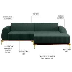 Altura: 76 cm | AssemblyRequired: Sim, sugerimos a contratação do nosso serviço de montagem (para os CEPs em que o serviço está dispon | Color: Verde | ColorFamily: Verde | ColorSimple: Verde | ColorSupplier: Verde | Cor: Verde | Gênero: Unisex | Largura: 245 cm | Manual: Sim | Marca: Domi | Material: Madeira Reflorestada | MaterialFamily: Madeira Reflorestada | Model: Molino | Origem: | OriginCountry: | OriginState: PR | Peso: 83 kg | Peso Suportado: 120 kg | ProductContents: 1 Sofá | ProductHeight: 76 | ProductInstructions: Produto para uso em ambiente interno, nao devendo ficar exposto ao sol, calor e umidade excessivos. | ProductLength: 85 | ProductWarranty: 90 dias após o do produto | ProductWeight: 83 | ProductWidth: 245 | Profundidade: 85 cm | Requere montagem: Sim | SizeDescription: 76 x 245 x 85 cm | SupplierSimpleName: Sofá 245cm 4 Lugares com Chaise Direito Pés Gold Molino C-117 Linho Verde - Domi | Tipo de : Fabricante
