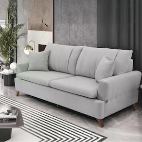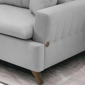 Sofá Eron 3 Lugares, é um requinte de sofá, desenvolvido para o cliente que procura conforto e bem estar em um único produto, com estilo moderno dando um toque de sofisticação ao ambiente. Estrutura em madeira de Eucalipto proveniente de reflorestamento, com grampos galvanizados, encosto fixo com cintas elásticas e almofadas soltas com enchimento de fibra siliconada e flocos de espuma, assento fixo com cintas elásticas e almofadas soltas com enchimento espuma HR 26 mais plumante, braços bordados e com espuma D20, tecido linho 66% algodão e 34% poliéster, botões decorativos em madeira, acompanham 2 almofadas decorativas e pés em madeira de Eucalipto na cor mel. Suporta até 110 kg por assento. Esse móvel chegará na sua casa separado em 01 volume.