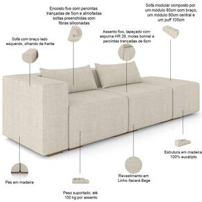 Sofá modular composto por um módulo 80cm com braço, um módulo 80cm central e um puff 105cm.