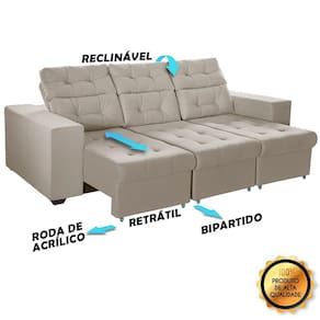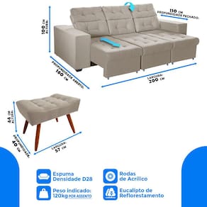 Sofá 3 Lugares Itália Plus 2 Metros, Retrátil Reclinável com 2 Puffs pés Palito. Sabe aquela sensação de felicidade e satisfação que você sente quando faz uma boa escolha?! Pois bem, essa é a sensação de comprar um sofá Itália Plus que possui um design moderno, acompanha 2 pufes elegantes que complementa o seu ambiente deixando ainda mais lindo e aconchegante. Ele possui encosto reclinável em cinco posições, proporcionando-lhe mais conforto na hora do descanso. E não para por aí: seu assento retrátil conta com espuma D28, transformando seu sofá em uma verdadeira cama para assistir seu filme preferido. Itens Inclusos 1 Sofá; 2 Pufes. Quantidade de Lugares: 3 Características: - Encosto Reclinável com 5 posições, almofadas fixas compostas de 100% fibra para maior conforto. - Assentos retráteis com percintas pneumáticas com feltro para proteger do atrito. - Braços com 25cm de largura e com espuma D28 e costuras duplas. - Fixação: Grampos galvanizados antiferrugem. - Estrutura de Madeira maciça 100% eucalipto de reflorestamento, produto ecologicamente correto. FABRICANTE: WS ESTOFADOS Medidas do sofá: Altura: 100cm Profundidade fechado: 110cm Profundidade aberto: 160cm Largura: 200cm Pé de tabaco:0,5 cm Rodas de silicone *Suporte até 120kg por assento *Módulos: 2 * Montagem Simples; *3 Meses de garantia. Informações importantes: – Os objetos que ambientam as fotos não acompanham o produto. – Tonalidade de cores pode sofrer variação conforme monitor visualizador. – Os tecidos podem sofrer alterações de tonalidades dependendo do lote de produção. – Verifique as dimensões do produto e certifique-se que o percurso que ele fará até o local de uso permite sua passagem. Quaisquer despesas ou danos no transporte até o local de uso ficam a cargo do cliente. “Em situação de escadaria ou Elevadores - Entregadores efetua apenas na portaria”. . . . . . Tag Você também pode Buscar por – Sofá, sofá reclinável, sofá retrátil, sofá grande, sofá luxo, sofá confortável, sofá para casa, sofá 2 Lugares, Sofá 4 lugares, sofá com Pillow Top, sofá para apartamento, sofá clean, sofá designer, sofá lugares, sofá Grande, sofá para filme.