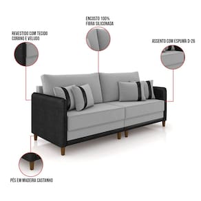 O Sofá 3 Lugares Living Valença é a escolha perfeita para quem busca um equilíbrio entre conforto e elegância em um espaço compacto. Com medidas de 192 cm, este sofá se destaca pelo design sofisticado e pela qualidade de seus materiais. O sofá é revestido em tecido sintético PU na cor Preta, com um acabamento em Veludo Cinza que proporciona um toque de sofisticação e aconchego. O sofá é fabricado com madeira de reflorestamento tratada, especificamente eucalipto. Já os pés são de madeira na cor castanho, com acabamento elegante que complementa o visual geral do móvel. O sofá possui assento e encosto fixos, garantindo uma estrutura sólida e sem movimento. A espuma utilizada é a D-28, conhecida por sua durabilidade e conforto. O assento é fixo, que garante um suporte firme e duradouro. Ele é equipado com molas espirais e percintas elásticas, além de uma manta acrílica que oferece um conforto extra. Este assento é projetado para suportar até 150 kg, garantindo robustez e estabilidade. O encosto é fixo e conta com percintas elásticas que sustentam almofadas soltas preenchidas com 100% fibra siliconada, proporcionando um apoio macio e confortável para as costas. Além do mais, as almofadas do encosto do sofá são adornadas com uma fita em sintético PU que segue a mesma tonalidade do revestimento, na cor Preta. Este detalhe não apenas realça o design do sofá, mas também oferece uma finalização elegante e refinada. Os braços do sofá são preenchidos com espuma D-23, o que proporciona um suporte confortável e equilibrado. A estrutura dos braços complementa o design do sofá, oferecendo uma superfície acolhedora para descansar os braços. Para garantir a durabilidade e resistência, os pontos de tensão do sofá são fixados com grampos galvanizados antiferrugem ou aparafusados, garantindo que o móvel mantenha sua integridade ao longo do tempo. A combinação desses materiais assegura um suporte ergonômico, ideal para relaxar após um longo dia. Invista no conforto e na sofisticação que você merece, o Sofá Valença está esperando por você!"