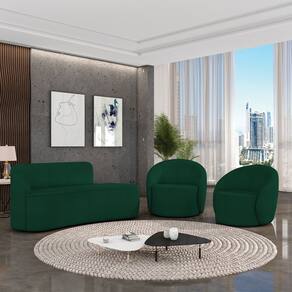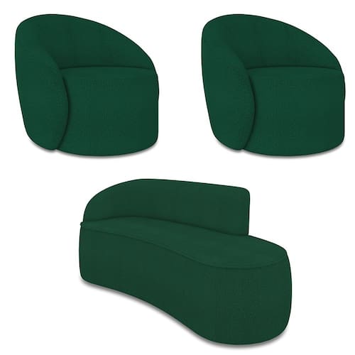 O Kit Sofá 3 Lugares Orgânico 180cm Morgan e 2 Poltronas Lua é um verdadeiro convite ao relaxamento! Ele possui um design orgânico que remete às formas encontradas na natureza que além de se moldar ao corpo humano, evoca uma sensação de calma e equilíbrio criando um espaço acolhedor e relaxante. O revestimento desse maravilhoso conjunto conta com um tecido extremamente elegante no Bouclê Verde, suportando em média até 240 kg de peso, podendo ser utilizado por pessoas de diferentes biotipos. A Poltrona Lua contém uma simetria artística e curvas suaves, ela contém uma Base Giratória com giro em 360 graus e uma estrutura em madeira de reflorestamento eucalipto, que garante a resistência e a sustentabilidade do produto. Ela tem um acabamento reforçado e espuma de qualidade D23, que oferece maciez e conforto. Ela contém detalhes de costura no encosto e um assento cilíndrico arredondado resultando em um acabamento perfeito conferindo muito mais valor e personalizado ao produto, oferecendo maior liberdade de movimento ao cliente. O Sofá Morgan por sua vez é uma combinação perfeita de conforto e estilo. Com uma estrutura robusta de madeira de eucalipto e MDF, este sofá garante durabilidade e resistência. Os assentos e encostos são fixos, o encosto é preenchido com espuma D-20, proporcionando suporte ideal para suas costas, enquanto o assento com espuma D-23 oferece uma experiência de assento firme e aconchegante. Seu formato curvo e sem braços traz um toque de modernidade, permitindo que o sofá se encaixe harmoniosamente em diversos estilos de decoração, desde o minimalista até o mais ousado. As sapatas plásticas são pequenas proteções colocadas na base dos pés do sofá para evitar que eles risquem ou danifiquem o chão. Além de proteger o piso, essas sapatas ajudam a distribuir o peso do sofá de maneira mais uniforme. Esse lindo conjunto pode ser utilizado em salas de estar, recepções, escritórios, lojas, espaços comerciais, ou qualquer outro espaço que você queira decorar com estilo e bom gosto. O kit Sofá Morgan e 2 Poltronas Lua é um produto que vai fazer a diferença na sua decoração e no seu bem-estar. Ele vai trazer charme, conforto e durabilidade para o seu ambiente. Corra e garanta o seu agora mesmo!