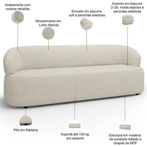 Características: Estrutura fabricada com madeira de eucalipto tratado e chapas em MDF. Revestimento em Linho na cor Mescla. Percintas elásticas no encosto e assento. Espumas do assento D-26 e com molas espirais. Encosto composto por espuma soft. Acabamento com costura rebatida, garantindo maior resistência a abertura de costuras. Pés em Madeira. Suporta até 100 kg por assento.