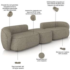 Sofá bipartido composto por dois módulos de 80cm com braços e um puff de 90cm.