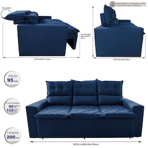 Sofá 3 Lugares Retrátil e Reclinável 2,00m Cama inBox Smal. com bordado pantográfico Suede - Azul Marinho