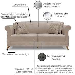 O Sofá Polo é uma ótima escolha para proporcionar o máximo de conforto e beleza ao seu espaço. Com um toque retrô clássico, possui 200cm de largura e revestimento linho de alta qualidade, adicionando sofisticação e classe ao seu ambiente. Os pés em madeira maciça garantem durabilidade e resistência. Seu encosto fixo é confeccionado em espuma D23 e plumante de silicone, proporcionando suporte e maior comodidade ao uso. O assento fixo é composto por percintas elásticas italianas e espuma HR28 de alta resiliência, que se destaca pelo retorno rápido à sua forma, aliando conforto e longa vida útil ao produto. Acompanha charmosas almofadas decorativas com enchimento em fibra de silicone e acabamento em matelassê, agregando ainda mais estilo e aconchego. Este móvel chegará em sua casa separado em 01 volume.