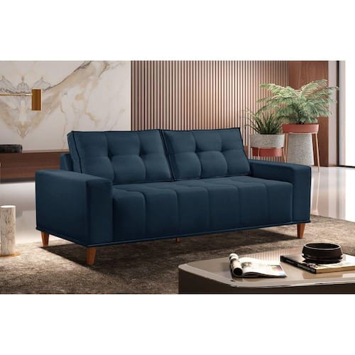 Se está buscando um sofá para transformar a sua sala de estar, vai se apaixonar pelo Sofá Beny! O design minimalista transforma o Beny em uma peça única, perfeito para inúmeras possibilidades de decorações. O assento em molas com espuma soft, garantem o conforto na medida certa. As almofadas soltas do encosto produzidas na fibra siliconada, aliadas ao toque macio do tecido veludo, proporcionam a sensação de estar sendo abraçado. Agora que já encontrou o sofá perfeito para a sua sala, é só clicar em comprar e já preparar o cafezinho para curtir os melhores momentos, com o conforto e sofisticação que merece! Acompanha Almofadas extras: Não Almofada do assento: Fixa Almofada do encosto: Removível Altura do assento até o chão: 47 cm Altura do Encosto: 43 cm Altura dos Pés: 7 cm Ambiente Principal: Sala de Estar Cor: Azul Bic Cor do Produto: Azul Bic Densidade do Assento: D-28 Densidade do Encosto: Camadas de Densidades Diferentes Enchimento do Assento: Hyper Soft Enchimento do Encosto: Fibra Siliconada Estilo de Braço: Braços Quadrados Firmeza do Assento: Médio Informações Complementares: Assento com molas bonnel e encosto com almofadas 100% fibras siliconadas Itens Inclusos: 1 Sofá Material dos Pés: Madeira Montagem Flex: Não aplicável Necessita Montagem: Não Origem do Produto: Nacional Peso: 46 kg Pet Friendly: Não Possui Percintas Elásticas: Sim Possui Pés: 05 Possui Rodízio: Não Recomendações de Uso, Manutenção e Limpeza: Utilizar pano levemente umedecido em água. Não expor diretamente à luz solar e não utilizar produtos abrasivos. Revestimento do Braço: Veludo Suporta Até (kg): 120 kg Tecido Predominante: Veludo Tipo de Encosto: Fixo Tipo de Mola: Molas Bonnel Marca: Zara Estofados