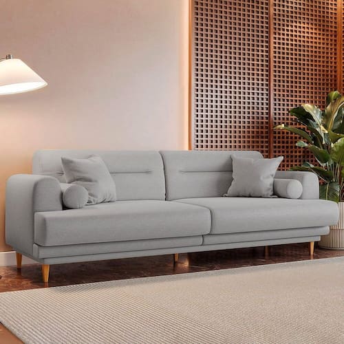 Linho 100% poliéster, espuma D28 supersoft, espuma D26, madeira maciça.Vendido e entregue por MadeiraMadeira