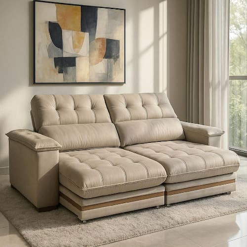 Com molas ensacadas e pillow top de 30 cm, o estofado oferece maciez e sustentação na medida certa. Quando aberto, alcança 1,80 m de profundidade, transformando-se praticamente em uma chaise para momentos de descanso e lazer. Seu design robusto com 1,10 m de altura e 1,20 m de profundidade quando fechado confere imponência e sofisticação ao ambiente.