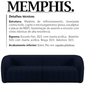 Sofa 4 Lugares 332 cm Memphis Veludo, é a escolha certa para você que busca conforto e bem-estar, tornando o ambiente em que estiver muito mais elegante e moderno. Estrutura em madeira de reflorestamento (pinus, eucaliptos e placas de MDF) e cintas elásticas de alta resistência. Composto por madeira imunizada contra mofo, cupim e microrganismos, revestimento em tecido veludo, encosto fixo em espuma D-23 com manta acrílica, assento em espuma D-26 com manta acrílica, braça em espuma D-23, adornos em espuma D-23, acabamento inferior em kami, acompanha sapatas plásticas. Suportando até 130 kg por assento. Possui design diferenciado, que oferece sofisticação, versatilidade e charme ao seu ambiente. Este móvel chegará na sua casa separado em 02 volumes.