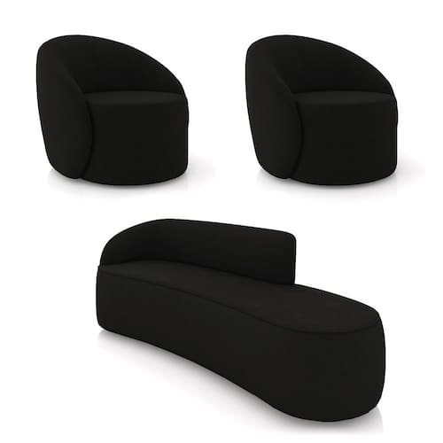O Kit Sofá 4 Lugares Orgânico 220cm Morgan e 2 Poltronas Lua é um verdadeiro convite ao relaxamento! Ele possui um design orgânico que remete às formas encontradas na natureza que além de se moldar ao corpo humano, evoca uma sensação de calma e equilíbrio criando um espaço acolhedor e relaxante. O revestimento desse maravilhoso conjunto conta com um tecido extremamente elegante no Suede Preto, suportando em média até 300 kg de peso, podendo ser utilizado por pessoas de diferentes biotipos. A Poltrona Lua contém uma simetria artística e curvas suaves, ela contém uma Base Giratória com giro em 360 graus e uma estrutura em madeira de reflorestamento eucalipto, que garante a resistência e a sustentabilidade do produto. Ela tem um acabamento reforçado e espuma de qualidade D23, que oferece maciez e conforto. Ela contém detalhes de costura no encosto e um assento cilíndrico arredondado resultando em um acabamento perfeito conferindo muito mais valor e personalizado ao produto, oferecendo maior liberdade de movimento ao cliente. O Sofá Morgan por sua vez é uma combinação perfeita de conforto e estilo. Com uma estrutura robusta de madeira de eucalipto e MDF, este sofá garante durabilidade e resistência. Os assentos e encostos são fixos, o encosto é preenchido com espuma D-20, proporcionando suporte ideal para suas costas, enquanto o assento com espuma D-23 oferece uma experiência de assento firme e aconchegante. Seu formato curvo e sem braços traz um toque de modernidade, permitindo que o sofá se encaixe harmoniosamente em diversos estilos de decoração, desde o minimalista até o mais ousado. As sapatas plásticas são pequenas proteções colocadas na base dos pés do sofá para evitar que eles risquem ou danifiquem o chão. Além de proteger o piso, essas sapatas ajudam a distribuir o peso do sofá de maneira mais uniforme. Esse lindo conjunto pode ser utilizado em salas de estar, recepções, escritórios, lojas, espaços comerciais, ou qualquer outro espaço que você queira decorar com estilo e bom gosto. O kit Sofá Morgan e 2 Poltronas Lua é um produto que vai fazer a diferença na sua decoração e no seu bem-estar. Ele vai trazer charme, conforto e durabilidade para o seu ambiente. Corra e garanta o seu agora mesmo!