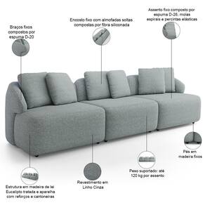 Cor: Cinza | ColorFamily: Cinza | ProductInstructions: Produto para uso em ambiente interno, nao devendo ficar exposto ao sol, calor e umidade excessivos. | Altura: 87 cm | Largura: 294 cm | Orientação do Sofá: Linear | Color: Cinza | Estilo: Moderno | Mecanismo de abertura do produto: na | Unidades por kit: 1 | ColorSimple: Cinza | Requer montagem: Não | Formato do sofá: Orgânico | Peso: 145 kg | Material de enchimento do encosto: Fibra Siliconada | Desenho do tecido: Liso | Cor dos pés: Marrom Escuro | OriginCountry: Brasil | Quantidade de Caixas de embalagem: 4 | SizeDescription: Altura: 87 cm x Largura: 294 cm x Profundidade: 87 cm | Peso máximo suportado: 480 kg | Tipo de produto: Sofá Modulado | Densidade da espuma do assento: D-26 | ColorSupplier: Cinza | OriginState: PR | ProductWidth: 294 cm | Material: Madeira de Eucalipto, Cantoneiras, Chapas em MDF | Linha: Sala de Estar, Living | ProductHeight: 87 cm | ProductWarranty: 90 dias após o recebimento do produto | ProductWeight: 145 kg | ProductLength: 87 cm | Material do estofamento: Linho | Model: Arlo | Fabricante: Lyam Decor | SupplierSimpleName: Sofá 4 Lugares Para Sala de Estar Living 294cm Arlo F04 Linho Cinza - Lyam Decor | ProductContents: 01 Sofá | MaterialFamily: Madeira de Eucalipto | Profundidade: 87 cm