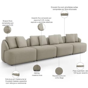 Profundidade: 87 cm | Quantidade de Caixas de embalagem: 3 | ColorFamily: Bege | Tipo de produto: Sofá Modulado | Estilo: Moderno | Unidades por kit: 1 | Color: Bege | ColorSimple: Bege | Peso máximo suportado: 360 kg | Peso: 170 kg | ColorSupplier: Bege | Desenho do tecido: Liso | Cor dos pés: Marrom Escuro | ProductWidth: 314 cm | ProductWeight: 170 kg | Requer montagem: Não | Orientação do Sofá: Linear | Material de enchimento do encosto: Espuma Soft | Formato do sofá: Orgânico | Model: Arlo | Cor: Bege | Material do estofamento: Linho | Material: Madeira de Eucalipto, Cantoneiras, Chapas em MDF | Fabricante: Lyam Decor | Linha: Sala de Estar, Living | Mecanismo de abertura do produto: na | OriginCountry: Brasil | ProductContents: 01 Sofá | ProductLength: 87 cm | Densidade da espuma do assento: D-26 | OriginState: PR | MaterialFamily: Madeira de Eucalipto | ProductInstructions: Produto para uso em ambiente interno, nao devendo ficar exposto ao sol, calor e umidade excessivos. | SizeDescription: Altura: 87 cm x Largura: 314 cm x Profundidade: 87 cm | ProductWarranty: 90 dias após o recebimento do produto | ProductHeight: 87 cm | SupplierSimpleName: Sofá 4 Lugares Para Sala de Estar Living 314cm Arlo F04 Linho Bege - Lyam Decor | Altura: 87 cm | Largura: 314 cm