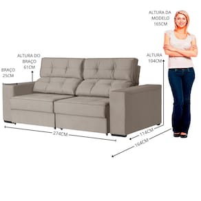 O design do EROS, com sua costura capitonê nos encostos e assentos extragrandes, garante um visual impactante e profundo conforto. Sua estrutura é retrátil e reclinável, permitindo que você personalize cada assento para um descanso ideal. É a fusão perfeita entre a estética da alta costura e a funcionalidade ergonômica. Produto Montado: Sim Acompanha Almofadas extras: Não Almofada do assento: Fixa Almofada do encosto: Removível Altura do assento até o chão: 46.0000 Altura do Encosto: 58 cm Altura dos Pés: 4 cm Altura Máxima dos Pés: 4.0000 Ambiente Principal: Sala de Estar codigo_ean: 7900288273130 Complexidade da Montagem: Média: pode ser montado por mais de uma pessoa e/ou necessite de maior conhecimento para montagem Cor: Bege Cor do Produto: Bege Estilo de Braço: Braços Quadrados Itens Inclusos: 1 Sofá e Kit Montagem Linha ou Coleção: Eros Manual de Especificação Técnica: https://product-hub-prd.madeiramadeira.com.br/656580687/documents/69bf9315-7d8d-4603-bd9e-0654e12cf2ec3290388579917612371491572.pdf Manual de Montagem e Instalação: https://product-hub-prd.madeiramadeira.com.br/656580687/documents/bc0dbbdd-8bf9-4cfe-9b3f-f70382be1bcd329038757991761237145133.pdf Marca: Konfort King Material dos Pés: Madeira Montagem Flex: não Necessita Montagem: Sim Origem do Produto: Nacional Pet Friendly: Não Possui Percintas Elásticas: Sim Possui Pés: 08 Possui Rodízio: Sim Profundidade Quando Estendido: 164 cm Recomendações de Uso, Manutenção e Limpeza: Não Utilize produtos químicos, nem aparelhos a vapor ou secador quente Revestimento do Braço: Veludo Rodízio com Trava: Não Sistema de Montagem: kit montagem Suporta Até (kg): 120 kg Tecido Predominante: Veludo Tipo de Encosto: Regulável Tipo de Mola: Molas Bonnel Tipo de Sofá: Sofá Comum Marca: Não Informado