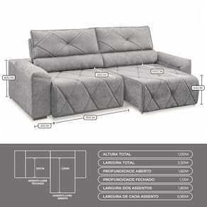 O Houston não é apenas um móvel, é um convite pra transformar a rotina em puro conforto. Seu visual imponente traz presença, enquanto o toque macio e o apoio firme acolhem corpo e mente. O assento retrátil amplia o espaço, e o encosto reclinável em 5 posições ajusta-se ao seu relax. Destaques: encosto reclinável, almofadas fixas, costura matelassê, assento retrátil até 1,60m, mola bonel e espuma D26 com camada soft, rodízios em silicone, estrutura em madeira maciça e suporte até 150kg por módulo. Produto Montado: Sim Acompanha Almofadas extras: Não Almofada do assento: Fixa Almofada do encosto: Removível Altura do assento até o chão: 45.0000 Altura do Encosto: 45 cm Altura dos Pés: 3 cm Altura Máxima dos Pés: 3.0000 Ambiente Principal: Sala de Estar codigo_ean: 7900288189677 Complexidade da Montagem: Baixa: pode ser montado por uma pessoa sozinha Cor: Nevoa Cor do Produto: Nevoa Estilo de Braço: Braços Pillow Top Informações Complementares: Almofadas acompanham a cor do sofá. Itens Inclusos: 1 Sofá, Manual de Montagem e Kit Ferragens Linha ou Coleção: Titanium Manual de Especificação Técnica: https://cdn2.madeiramadeira.com.br/atributo/coliseu-moveis-e-decoracoes/2969394-6438-1748885674147.pdf Manual de Montagem e Instalação: https://product-hub-prd.madeiramadeira.com.br/733630031/documents/56b1e7ce-0f99-4b35-9f74-27b8ca4312e3afbcb96b0bd476a21747939243.pdf Marca: Apolo Estofados Material dos Pés: Plástico Montagem Flex: Encaixe de encostos, pés e rodízios Necessita Montagem: Sim Origem do Produto: Nacional Peso: 81 kg Pet Friendly: Não Possui Percintas Elásticas: Sim Possui Pés: 08 Possui Rodízio: Sim Profundidade Quando Estendido: 160 cm Profundidade quando extendido: 160.0000 Recomendações de Uso, Manutenção e Limpeza: Recomenda-se aspirar regularmente o sofá para manter o tecido livre de poeira. Em caso de manchas, utilize um pano limpo e umedecido, evitando esfregar com força. Sempre teste produtos de limpeza em uma área discreta antes do uso. Tecidos como microfibra, poliéster e modelos com proteção antimanchas são mais práticos para o dia a dia. Sistema de Montagem: O sofá é enviado com um kit contendo 8 pés, 4 rodízios e os parafusos correspondentes, acondicionados em saco plástico. Para montagem, fixe os pés nos quatro cantos da base, garantindo que estejam apoiados sobre a madeira de reforço. Em seguida, parafuse Suporta Até (kg): 150 kg Tecido Predominante: Boucle Tipo de Encosto: Regulável Tipo de Mola: Molas Bonnel Tipo de Sofá: Sofá Comum