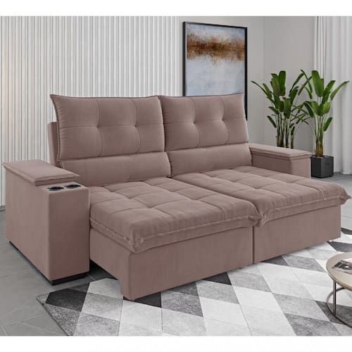Características: Estrutura em Eucalipto Retrátil corre no tubo Reclinável em até 5 posições Duplo Molejo Pillow top Molas ensacadas Espuma D23 Encosto 100 fibra siliconada Braço com um porta copos Bipartido 8 Pés 4 Rodízios Revestido com tecido veludo Suporta até 270kg totais