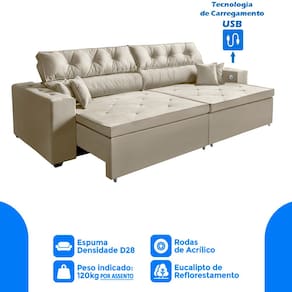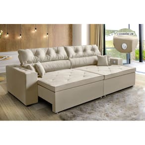 Sofá 5 Lugares Smart Retrátil, Reclinável 3,02 Metros, Tecnologia Carregamento 3 portas USB Bege