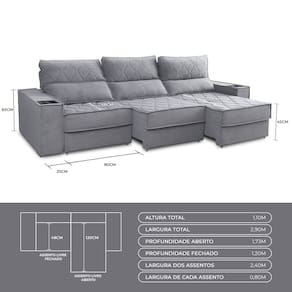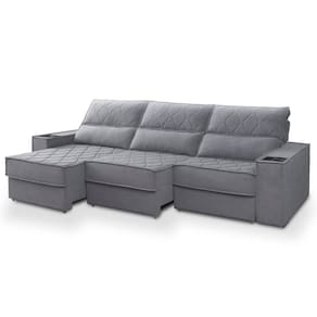 Revestido em suede macio e resistente, possui assentos retráteis e encostos reclináveis, ideais para relaxar. Sua estrutura em madeira de eucalipto com percintas elásticas suporta até 150 kg por assento. O enchimento em fibra siliconada e os pés reforçados garantem firmeza e durabilidade.