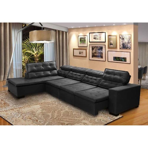 Renove com muita ousadia e elegância o seu ambiente preferido de descanso e descontração, com o Sofá 7 Lugares de Canto Retrátil e Reclinável Sttilo com Chaise 3,60 na cor PRETO, fabricado pela MegaSul, qual possui encosto reclinável, com catraca silenciosa 5 estágios, almofadas fixas de fibra siliconada, ideal para você aproveitar o seu momento de assistir seus programas de TV preferidos, ou reunir a família junto! Valorize e complete o seu lar com muita beleza e funcionalidade! Aproveite e experimente o novo!