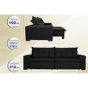Informações importantes: * Os objetos que ambientam as fotos não acompanham o produto. * Fique atento, nossas cores podem sofrer alterações dependendo do seu monitor. * Verifique as dimensões do produto e certifique-se que o percurso que ele fará até o local de uso permite sua passagem. * Nos responsabilizamos pela entrega dos produtos adquiridos até a porta de entrada ou portaria do endereço indicado. Quaisquer despesas ou dano no transporte até o local de uso ficam a cargo do cliente. Tipo de Sofa: Retrátil Reclinável | É sofá de canto: Não | É sofá-cama: Não | Encosto Reclinavel: Sim | Assento Retratil: Sim | Cor: Preto | Tonalidade: Preto | Desenho do tecido: Liso | Acessórios incluídos: N/A | Fabricante: Cama Inbox | Quantidade de Lugares: 6 | Altura: 102 | Peso do Produto: 80 | Largura: 312 | Profundidade: 117 | Material do estofado: Madeira Reflorestada, Espuma, Tecido | Complexidade de Montagem: Baixa: pode ser montado por uma pessoa leiga | Estilo: Moderno | Tempo Estimado de Montagem: 30 Minutos | Produto: Sofá | Comodo indicado: Salas | Custo da Manutenção: Baixo | Conservação e Manutenção do Produto: Para maior durabilidade, recomendamos que a limpeza dos estofados com revestimento em tecido, seja feito com aspirador de pó em baixa rotação ou escova com cerdas macias para a eliminação de poeira e pano úmido em água. Não utilizar agentes químicos! | Condição do item: Novo | É kit: Não | Complexidade de Montagem Via: Fácil de Montar | Cor Via: Preto | Quantidade de Lugares Via: Acima de 4 Lugares | Estado de Origem: PR