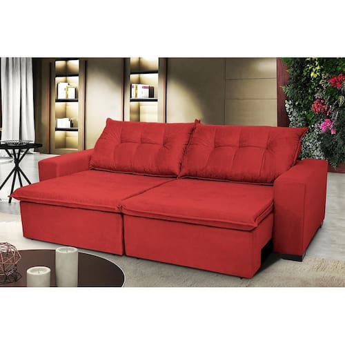 Sofá Austrália 3,12 Mts Retrátil, Reclinável Com Molas E Pillow No Assento Tecido Suede Vermelho Decore sua sala de estar com sofisticação e qualidade, sem abrir mão do conforto. Moderno e aconchegante, o Sofá Austrália é produzido com madeira maciça (eucalipto) e possui design moderno com traços retos. Ótima opção para sua sala ou até mesmo escritório. O que o torna especial são seus assentos retráteis e seus encostos reclináveis que proporcionam uma acomodação extremamente confortável. Desfrutar de um bom filme na sala jamais será como antes!