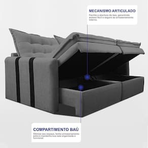 Conforto dos Assentos: Feito com Espuma SoftGel D40 de alta densidade com Tecnologia Thermogel, onde não absorve calor do corpo, mantendo sempre o sofá com sensação FRESH e Aconchegante, percintas Extra Support sendo mais resistente e durável, mantas siliconadas e seus assentos contam com a função baú para maior praticidade e organização.