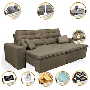 Sofá Cairo 2,32m Retrátil, Reclinável Tecido Suede Castor Procurando um estofado amplo, confortável, bonito e que combine com seu ambiente? Conheça o Sofá Cairo. Seus Assentos retráteis são compostos por espuma D28 e Pillow com manta em fibra de silicone, proporcionando muito conforto. Seus encostos reclináveis em 5 estágios possuem fibra siliconada e flocos de espuma. Sua estrutura é desenvolvida em madeira de eucalipto de reflorestamento o que proporciona maior segurança e qualidade ao sofá cairo. Desfrutar de um bom filme em sua sala não será mais como antes... Características: - Encosto: Reclinável em fibra de silicone / Flocos de espuma - Assentos: Assento Retrátil com percintas tipo Italiana, Pillow composto por espumas progressivas, manta de 5cm espuma de poliuretano d28 + manta de 05cm de espuma híper soft d28 + manta acrílica siliconada, tudo isso para oferecer um conforto inigualável! - Braços em espuma D23 - Acompanha 4 lindas Almofadas que combinam perfeitamente com seu designer compostas por fibra de silicone e flocos de espuma revestidas com o mesmo tecido do estofado. - Fixação: Grampos galvanizados - Estrutura desenvolvida em madeira de eucalipto e pinus - Suporta até 110kg por pessoa