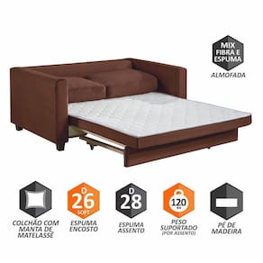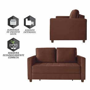 Características: - Estrutura de madeira de reflorestamento, seca e imunizada; - Espumas utilizadas de fabricação própria; - Encosto - Fixo com espuma D28, almofadas soltas preenchidas 100 com fibra siliconada e revestida com manta siliconada fina; - Assento - Extensível, com espuma D28 revestida com manta de espeuma D28 soft e manta siliconada; - Extrado de madeira de eucalipto envernizada; - Revestimento - Tecido Veludo Paris - Pés de madeira de excelente qualidade com acabamento em verniz.