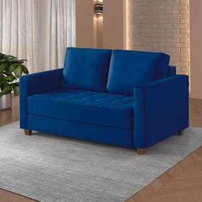 Sofá Cama Marcelle 2 Lugares 150 Casal Veludo Paris Pés De Madeira Talento Móveis Azul Com Castanho Disponível no modelo casal e solteiro, o sofá cama Marcelle atende a todos os perfis de usuário. Os Pés de madeira dão a sustentação e confiança necessária, além de almofadas soltas para facilitar no seu manuseio.