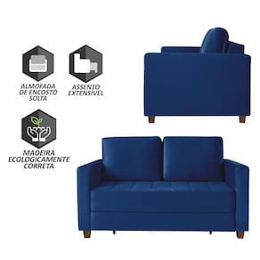 Características: - Estrutura de madeira de reflorestamento, seca e imunizada; - Espumas utilizadas de fabricação própria; - Encosto - Fixo com espuma D28, almofadas soltas preenchidas 100 com fibra siliconada e revestida com manta siliconada fina; - Assento - Extensível, com espuma D28 revestida com manta de espeuma D28 soft e manta siliconada; - Extrado de madeira de eucalipto envernizada; - Revestimento - Tecido Veludo Paris - Pés de madeira de excelente qualidade com acabamento em verniz.