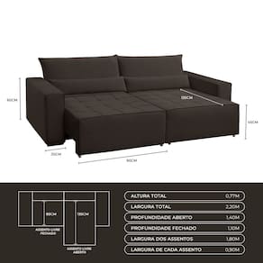 O Nepal é ideal pra quem valoriza liberdade e bem-estar. Com encosto removível e almofadas soltas, se transforma facilmente em uma cama. O design bipartido facilita transporte e montagem, enquanto o assento retrátil amplia o espaço pra relaxar. Estrutura firme em madeira de reflorestamento, espuma D26 com suporte de até 150kg por módulo e rodízios em silicone para movimentação suave. Um sofá que se adapta a você, seja para receber, assistir ou descansar. Produto Montado: Sim Acompanha Almofadas extras: Não Almofada do assento: Fixa Almofada do encosto: Removível Altura do assento até o chão: 45.0000 Altura do Encosto: 36 cm Altura dos Pés: 3 cm Altura Máxima dos Pés: 3.0000 Ambiente Principal: Sala de Estar codigo_ean: 7900288205995 Complexidade da Montagem: Baixa: pode ser montado por uma pessoa sozinha Cor: Marrom Cor do Produto: Marrom Estilo de Braço: Braços Quadrados Informações Complementares: Almofadas acompanham a cor do sofá. Itens Inclusos: 1 Sofá e Kit Ferragens Linha ou Coleção: Nepal Manual de Especificação Técnica: https://product-hub-prd.madeiramadeira.com.br/645010496/documents/4538639d-af3c-4e97-986b-f583cbbfa0662970382643817488926312433.pdf Manual de Montagem e Instalação: https://product-hub-prd.madeiramadeira.com.br/645010496/documents/ea77410a-a1d8-43ba-b5e3-21aad46626aaafbcb96b0bd476a21747939238.pdf Marca: Apolo Estofados Material dos Pés: Plástico Montagem Flex: Encaixe de encostos, pés e rodízios Necessita Montagem: Sim Origem do Produto: Nacional Peso: 90 kg Pet Friendly: Não Possui Percintas Elásticas: Sim Possui Pés: 08 Possui Rodízio: Sim Profundidade Quando Estendido: 140 cm Profundidade quando extendido: 140.0000 Recomendações de Uso, Manutenção e Limpeza: Recomenda-se aspirar regularmente o sofá para manter o tecido livre de poeira. Em caso de manchas, utilize um pano limpo e umedecido, evitando esfregar com força. Sempre teste produtos de limpeza em uma área discreta antes do uso. Tecidos como microfibra, poliéster e modelos com proteção antimanchas são mais práticos para o dia a dia. Sistema de Montagem: O sofá é enviado com um kit contendo 8 pés, 4 rodízios e os parafusos correspondentes, acondicionados em saco plástico. Para montagem, fixe os pés nos quatro cantos da base, garantindo que estejam apoiados sobre a madeira de reforço. Em seguida, parafuse Suporta Até (kg): 150 kg Tecido Predominante: Suede Tipo de Encosto: Regulável Tipo de Mola: Molas Bonnel Tipo de Sofá: Sofá Cama