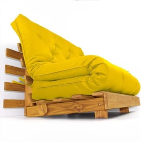 Material e estrutura: O colchão futon casal é fabricado em tecido de alta qualidade em sarja peletizada 100% algodão, seu enchimento é de mantas de algodão natural, manta fibra siliconada estruturado por espuma ortopédica D28. Possui amarras nas extremidades, a estrutura é produzida em madeira maciça de pinus autoclave com pintura na cor mel.