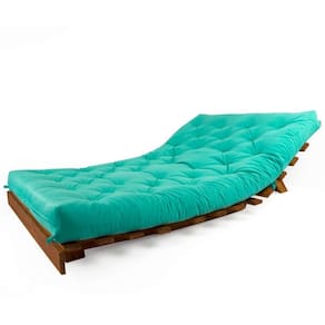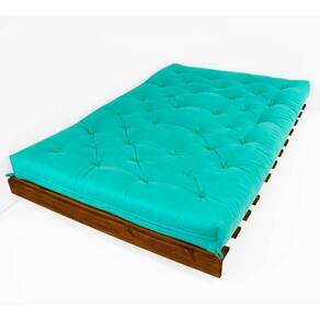 Colchão futon casalEnchimento de mantas de algodão natural e manta de fibra siliconadaEstrutura de espuma ortopédica D28Amarras nas extremidadesBase de madeira maciça