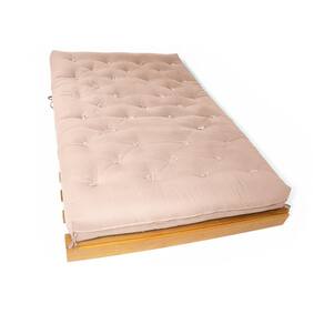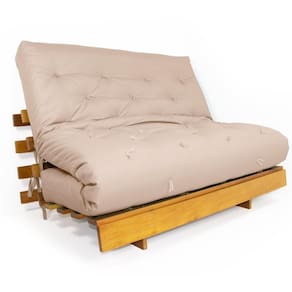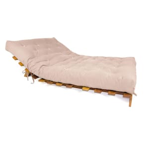 Material e estrutura: O colchão futon casal é fabricado em tecido de alta qualidade em sarja impermeável, seu enchimento é de mantas de algodão natural, manta fibra siliconada estruturado por espuma ortopédica D28. Possui amarras nas extremidades, a estrutura é produzida em madeira maciça de Grapia com pintura na cor natural.