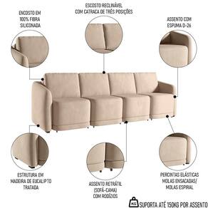 Essa peça impressionante foi projetada para trazer conforto e estilo ao seu espaço, principalmente com o recurso retrátil, em que você pode ajustar facilmente o sofá para atender às suas necessidades de assento, além de aproveitá-lo como cama e acomodar perfeitamente as suas visitas. Isso porque, a espuma D26 garante o máximo de conforto, enquanto o revestimento de alto padrão acrescenta um toque de elegância. Seja para assistir a um filme ou para receber convidados, esse sofá 4 lugares será o complemento perfeito para a sua sala de estar.