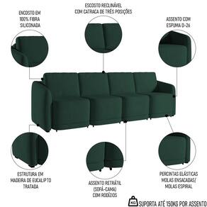 Características do Produto Material da estrutura: Madeira de Eucalipto Tratada. Material do Assento: Espuma D-26. Material do Encosto: 100% Fibra Siliconada. Revestimento: Veludo. Peso Suportado: 150 kg por assento. Quantidade de Assentos: 4 Assentos. Quantidade de Lugares: 4 Lugares. Tipo de Encosto: Reclinável com Catraca 3 Posições. Tipo de Assento: Retrátil. Possui Pés: Sim. Possui Rodízios: Sim. É sofá-cama: Sim. Diferenciais: - Design moderno. - Sofá cama modular. - Acompanha almofadas. - Assento com percintas elásticas, molas ensacadas e molas espiral. Sistema de Montagem: O produto é enviado montado, sendo necessário apenas a junção dos módulos. Manual de Montagem: Não. Volumes: 4 Volumes. Conteúdo da Embalagem: 1 Sofá Cama. Garantia do Fabricante: 90 dias contra defeito de fabricação. Montagem: Recomendamos que seja feita por um profissional. Recomendação de Limpeza: Utilize pano levemente úmido.