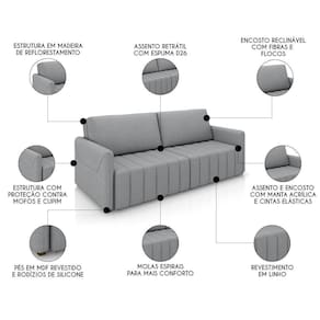 Por ser um sofá sem caixa, esse estofado otimiza o espaço de circulação, enquanto que com um simples movimento de reclinação do encosto o sofá se transforma em uma cama casal confortável, graças a tapeçaria com espuma de alta densidade e reforço com cintas elásticas. Para completar a funcionalidade, o design moderno com linhas retas faz com que esse sofá retrátil seja um ícone de charme e beleza na decoração do seu ambiente.