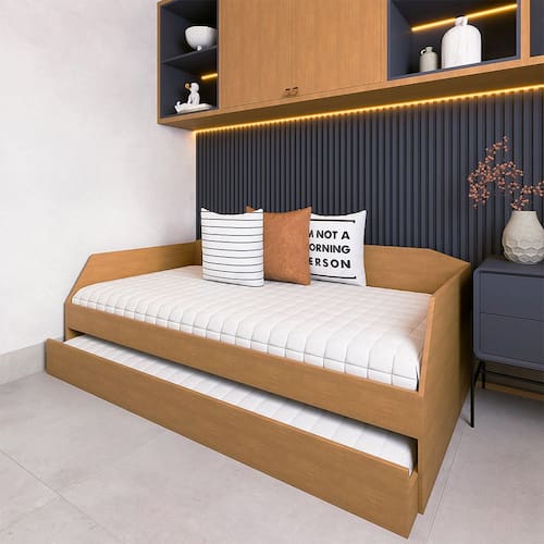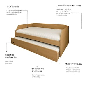 A cama auxiliar conta com rodízios deslizantes, que facilitam o manuseio e tornam a abertura prática e suave. Além disso, o estrado de madeira da cama auxiliar possui travessas antirruído, garantindo noites de sono mais silenciosas e confortáveis. Perfeito para quem quer unir conforto, funcionalidade e beleza em um único móvel.
