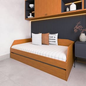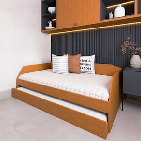 A cama auxiliar conta com rodízios deslizantes, que facilitam o manuseio e tornam a abertura prática e suave. Além disso, o estrado de madeira da cama auxiliar possui travessas antirruído, garantindo noites de sono mais silenciosas e confortáveis. Perfeito para quem quer unir conforto, funcionalidade e beleza em um único móvel.