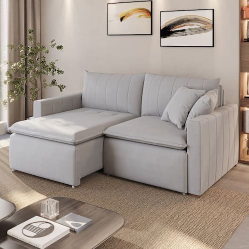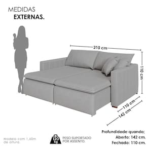 Ao estender o assento, transforma-se em um sofá-cama amplo e confortável, perfeito para hóspedes e descanso prolongado. Produto Montado: Sim Acompanha Almofadas extras: 02 Almofada do assento: Fixa Almofada do encosto: Removível Altura do assento até o chão: 50.0000 Altura do Braço: 64 cm Altura do Encosto: 60 cm Altura dos Pés: 5 cm Altura Máxima dos Pés: 5.0000 Ambiente Principal: Sala de Estar codigo_ean: 7900288221285 Complexidade da Montagem: Baixa: pode ser montado por uma pessoa sozinha Cor: Cinza Claro Cor do Produto: Cinza Claro Densidade do Assento: D-28 Enchimento do Assento: Espuma Enchimento do Braço: Espuma D-23 Enchimento do Encosto: Fibra Siliconada Estilo de Braço: Braços Quadrados Firmeza do Assento: Médio Itens Inclusos: 1 Sofá, 2 Almofadas e Kit Ferragens Largura do Braço: 15 cm Largura Total: 210 cm Linha ou Coleção: Uruguai Manual de Montagem e Instalação: https://product-hub-prd.madeiramadeira.com.br/841101961/documents/8a4e9778-782f-439a-84fa-511f2e91e4f53178125596417568431868034.pdf Marca: Conceito Estofados Material da Corrediça do Sofá: Madeira Material dos Pés: Madeira Medida como Cama (A x L x P): 50x180x140 Modelo: Retrátil e Reclinável Necessita Montagem: Sim Nível de Conforto: Intermediário Origem do Produto: Nacional Peso: 94 kg Pet Friendly: Não Possui Baú: Não Possui Percintas Elásticas: Sim Possui Pés: 05 Possui Rodízio: Sim Profundidade Quando Estendido: 142 cm Profundidade quando extendido: 142.0000 Reclinável: Sim Recomendações de Uso, Manutenção e Limpeza: Limpar com pano seco ou levemente úmido com água, apenas. Revestimento do Braço: Linho Sistema de Montagem: Parafusos e encaixes Tecido Predominante: Linho Tipo de Assento: Fixo Tipo de Mola: Molas Bonnel Tipo de Sofá: Sofá Cama Marca: Não Informado