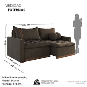 Ao estender o assento, transforma-se em um sofá-cama amplo e confortável, perfeito para hóspedes e descanso prolongado.